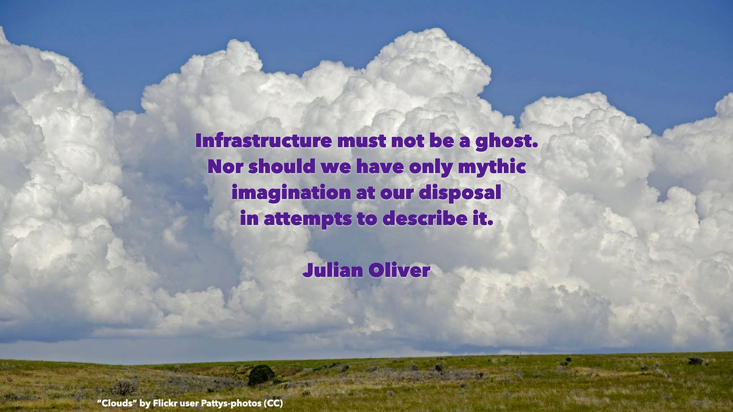 Infrastructure must not be a ghost. Nor should we have only mythic imagination at our disposal in attempts to describe it. 'The Cloud' is a good example of a dangerous simplification at work, akin to a children's book. Such convenient reductions will be expensive in time as some corporations and governments continue to both engineer - and take advantage of - ignorance.