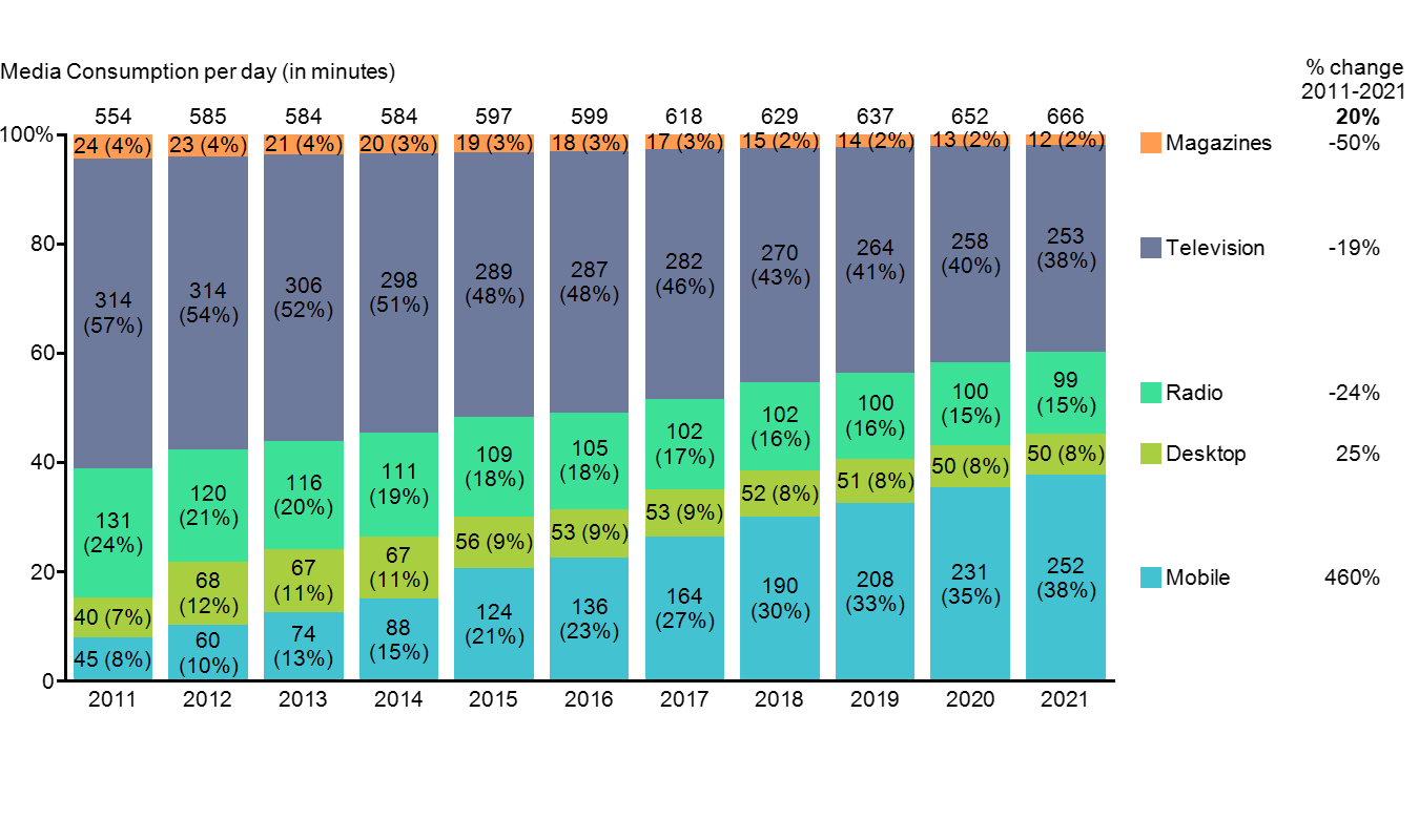 This is just an example. Each of the eleven bars above could be refashioned into a pie graph which would divvy up the media consumption statistics for a given year, but by laying them out as stacked bars, and organizing them chronologically, this graph shows how mobile consumption exploded over the course of those 11 years. It also shows the corresponding decline in more traditional media.