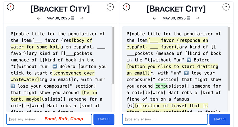 Over the past month or so, I’ve really enjoyed an online puzzle game which was new to me, Bracket City over at The Atlantic’s website. It’s joined Puzzmo and Minute Cryptic as browser tabs that I leave open and just refresh daily. Bracket City takes a news event from that day in history, and then extends it by folding in a whole bunch of nested clues that you have to eliminate by correctly answering them. So in the example below, the left pane is today’s puzzle, while the right pane is what it looks like after I’ve answered the first 3 (yellow highlighted) clues, but before I’ve answered “por” and “compose.”