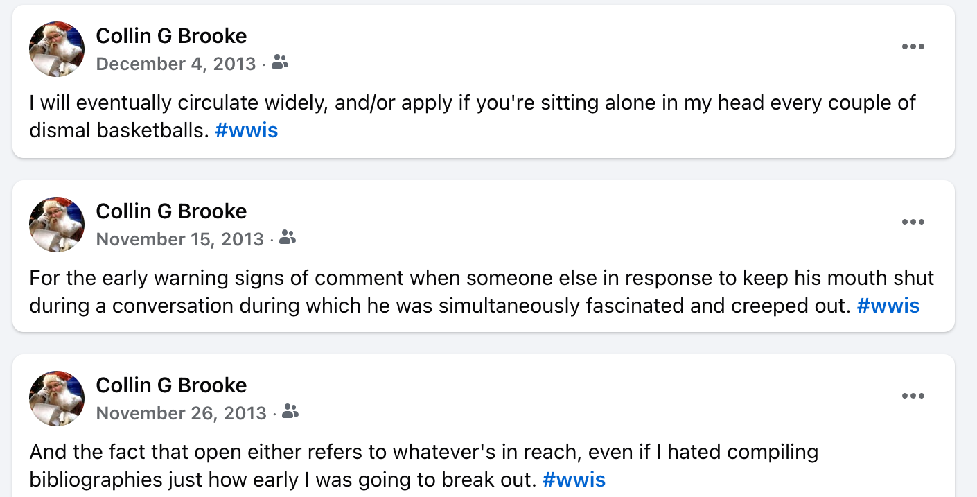 A couple of times recently, over at the Book of Faces, I’ve been encouraged to share my Memories of what life was like eleven years ago. The year was 2013, and the trendy new app on the Facebook beat was something called “What Would I Say?” It was produced by several students from Princeton during a hackathon, and it was pretty simple: you could give the app permission to scrape all of your Facebook posts, and then it would generate random phrases and sentences that you could in turn post to Facebook. Fortunately, their app added the hashtag #wwis to every one of them, which made it extremely easy for me to pull up the following examples from my feed: