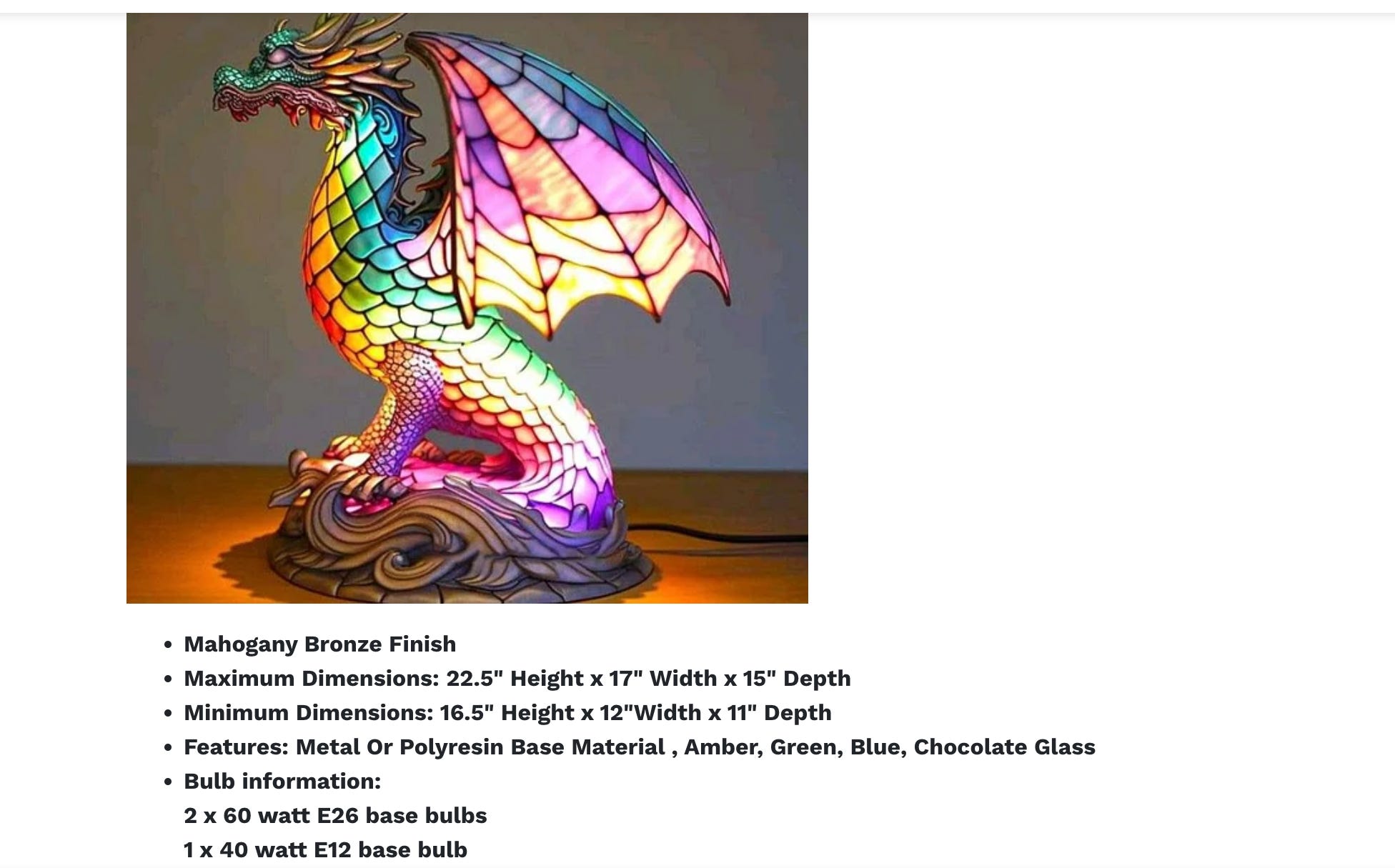 The more gullible among us, like I was, might interpret these bullet points as referential, as a description of the product next to which they appear. However, the site doesn’t say this explicitly. Spoiler: when it says “metal or polyresin,” the fact that there is no metal at all isn’t technically inaccurate. Also, “Chocolate Glass” appears to be their own name for a color, because there is no glass in the product. Finally, I really appreciate the touch of including a fake electrical cord in the picture, leading me to believe that this would be an actual lamp that plugged into an outlet. (It is not.)